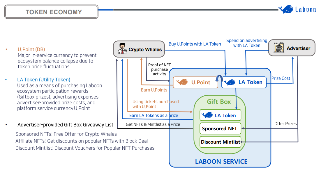 U.point is used as the main currency in the service to minimize the ecosystem balance and gas costs due to token price fluctuations. However, in order to support transparent and accurate rewards and transactions, we intend to utilize Laboon Token, which is recorded on the blockchain for ecosystem participation rewards, advertising costs, and prize costs. Laboon Token can be converted to U.point at the exchange rate, but U.point is not exchanged for Laboon Token.